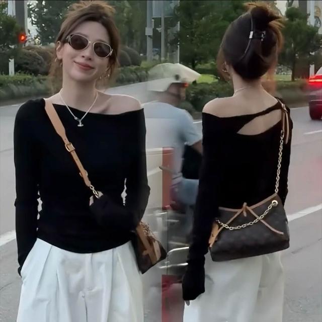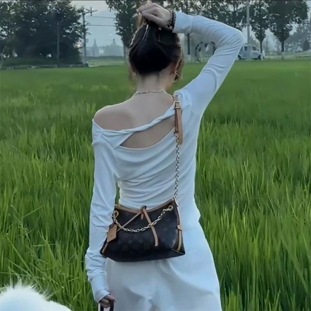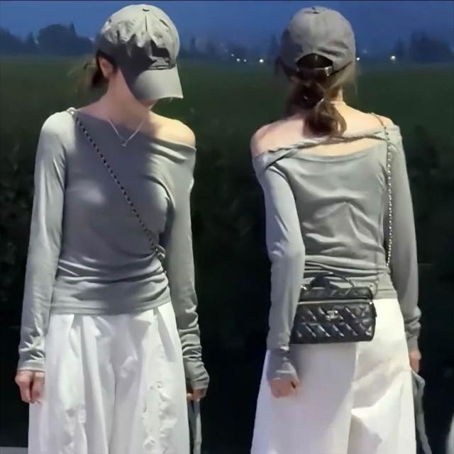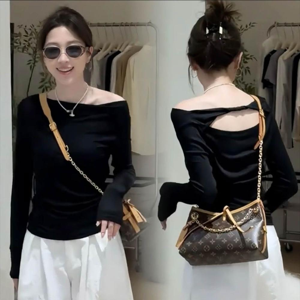 設計感韓版後背鏤空斜肩兩穿 減齡洋氣長袖T恤女 2026早春新款上衣