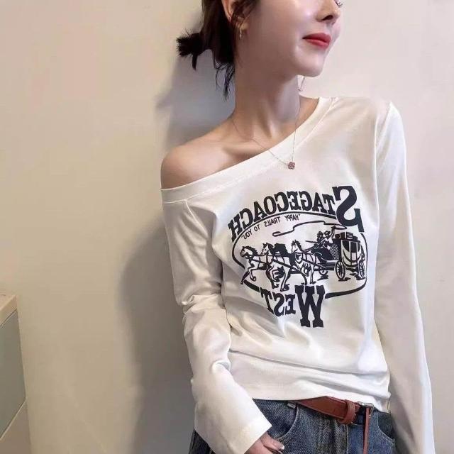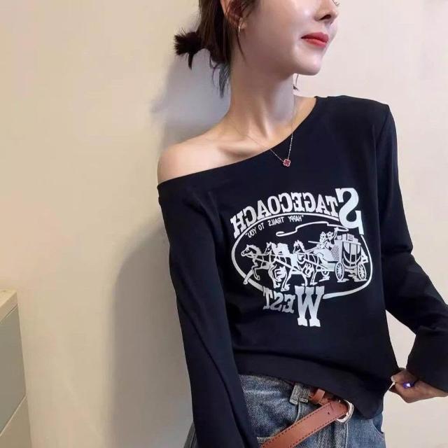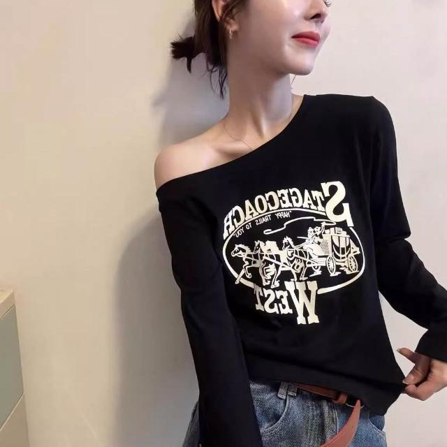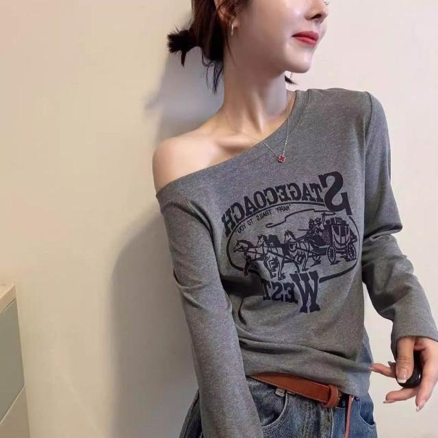 美式辣妹印花一字領長袖t恤女 2026秋季新款時尚復古修身上衣潮