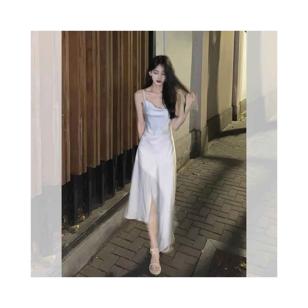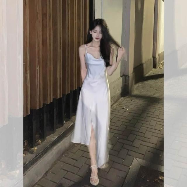 法式名媛白色緞面吊帶連衣裙女 夏季小衆設計高級感氣質小個子裙子