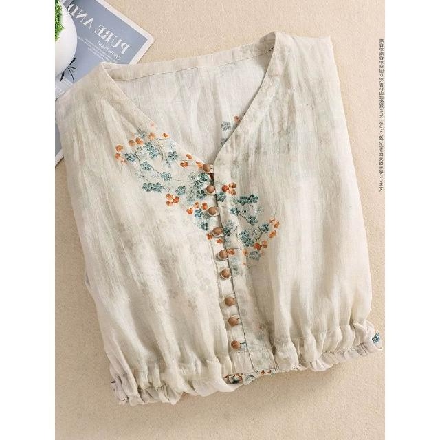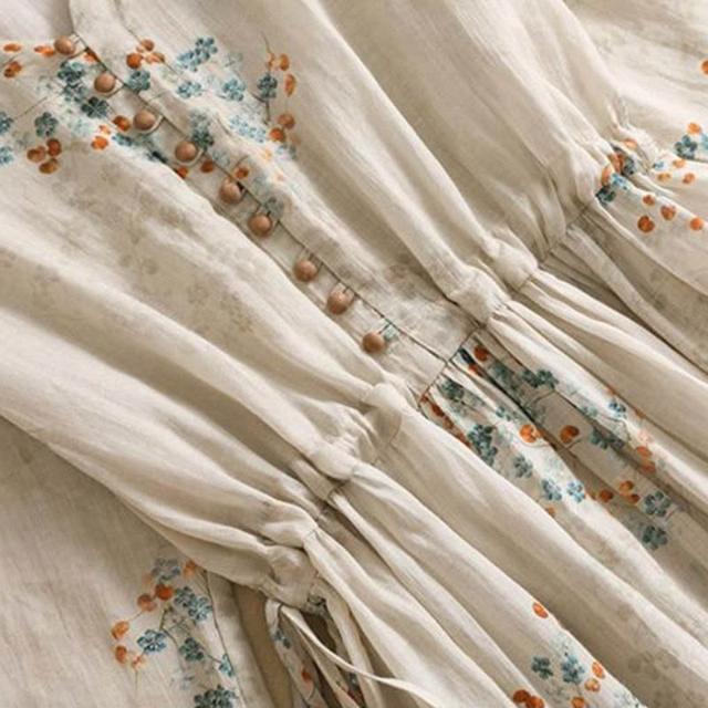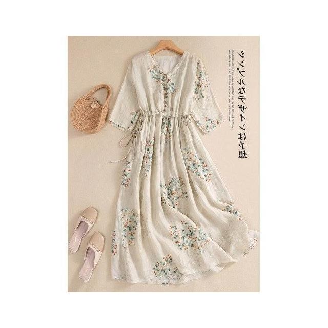 復古田園杏色印花棉麻連衣裙女 夏季優雅收腰繫帶亞麻 大擺長裙子