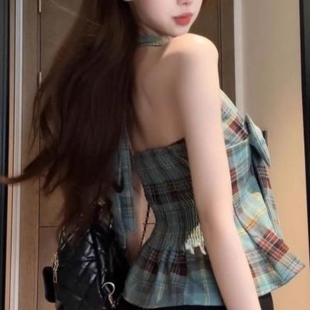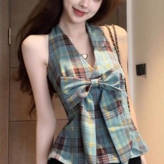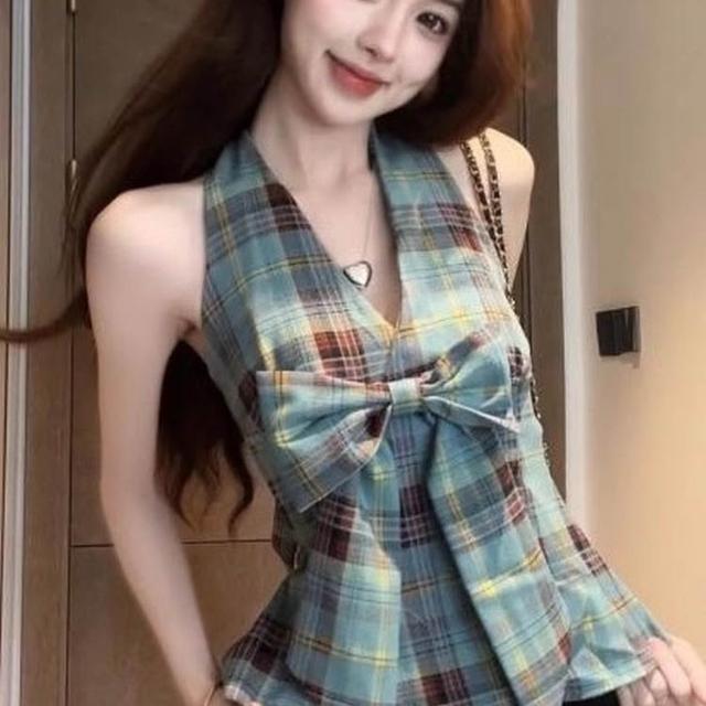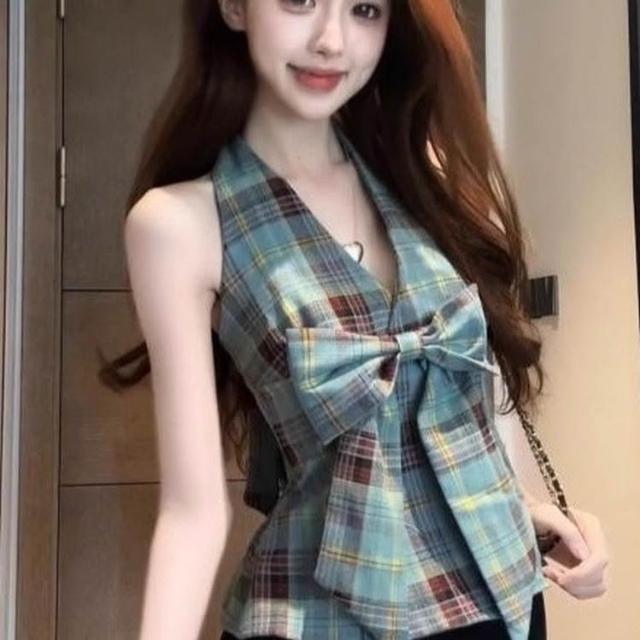 純美風撞色格子掛脖襯衫背心女 2026新款夏季 高級感蝴蝶結辣妹上衣