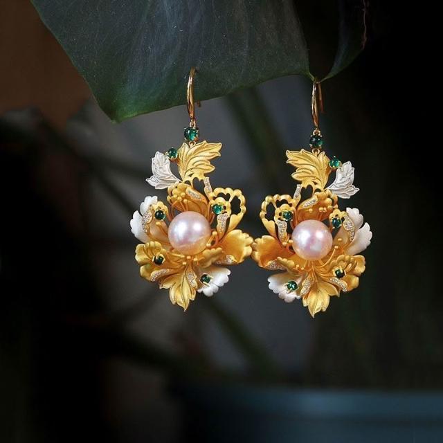 『國色天香』新中式宮廷風漢服旗袍古風 花絲牡丹花珍珠耳環女耳飾