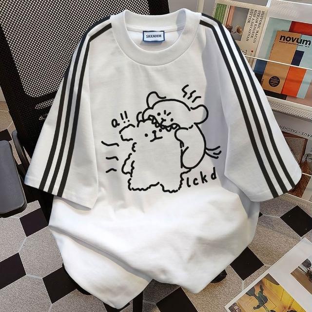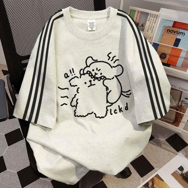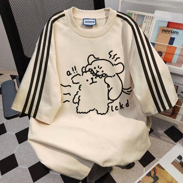美式oversized夏天純棉T 線條小狗趣味印花三條槓短袖t恤女 夏季新款寬鬆情侶上衣