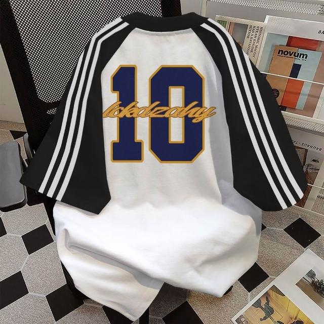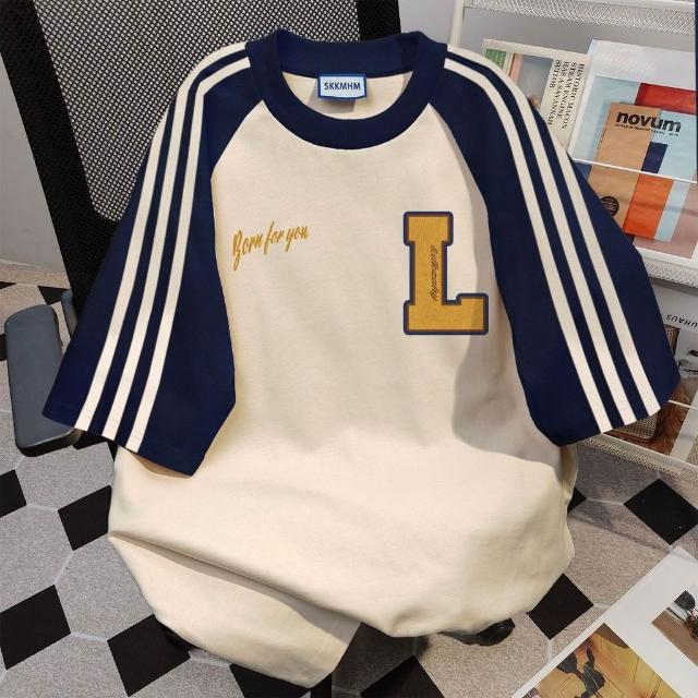 美式oversized夏天純棉T 歐美高街字母印花三條槓 圓領短袖t恤女 夏季撞色寬鬆上衣