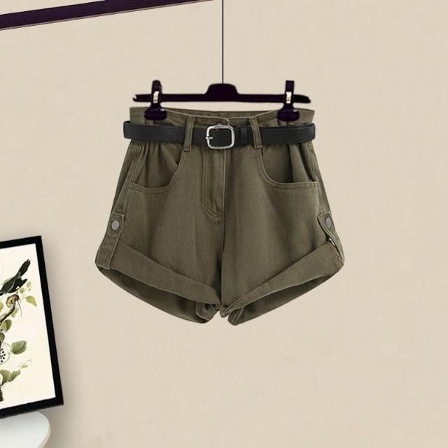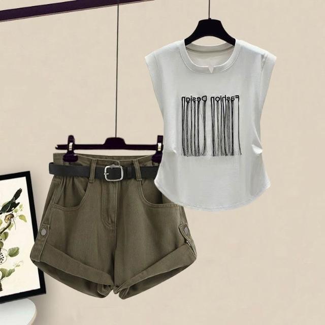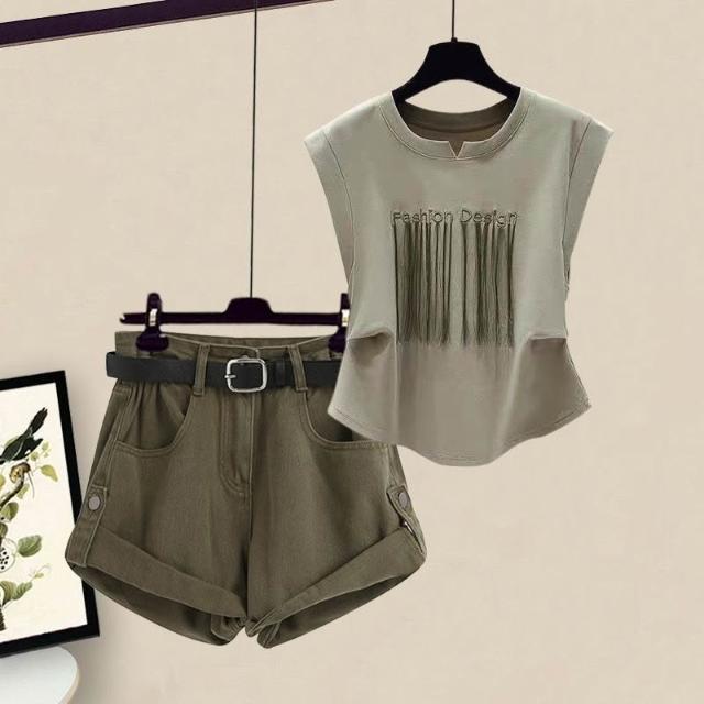 美式oversized夏季套裝女 新款設計感飛飛袖上衣 顯瘦牛仔短褲 炸街減齡兩件套