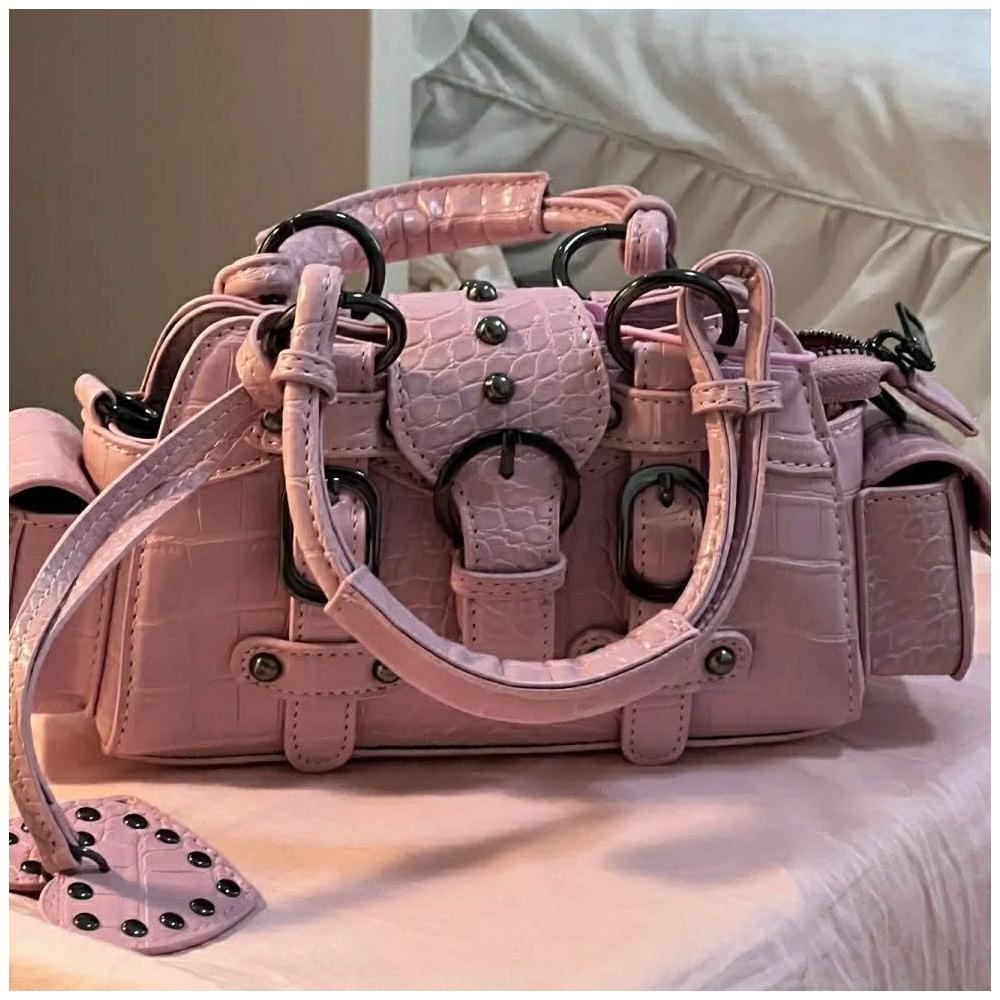 vintage原創復古千禧風 鱷魚紋方形鉚釘手提包 翻蓋手拎腋下斜跨包