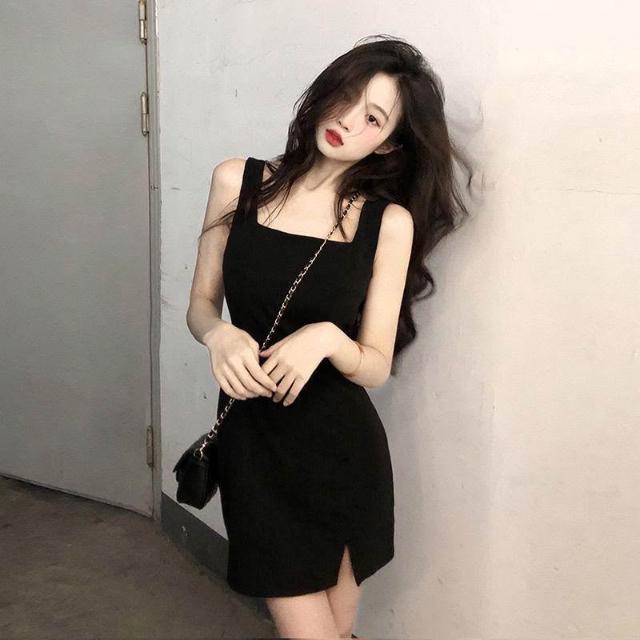 時髦港風寬肩帶 黑色吊帶裙 修身氣質開叉 顯瘦小個子連衣裙女夏