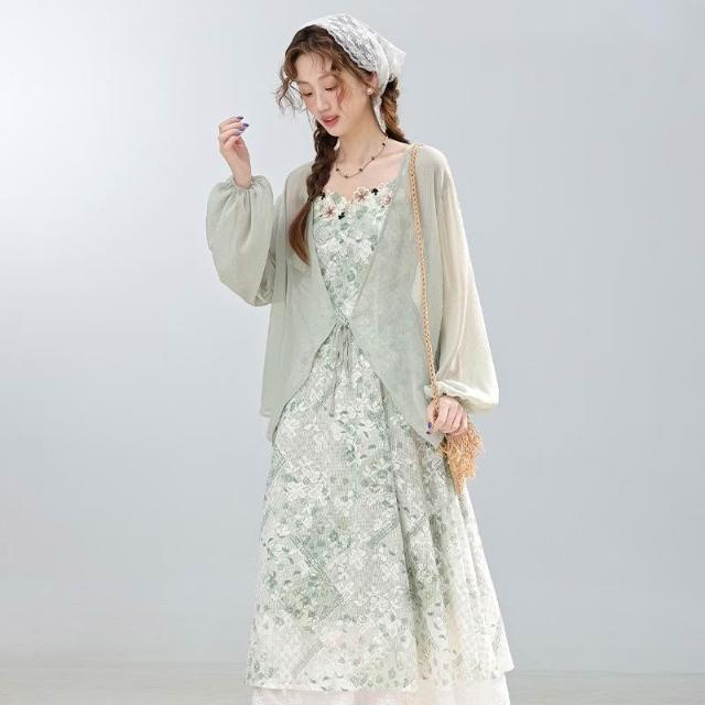 薄荷茶紀夏季度假風 綠色吊帶連衣裙 收腰長裙