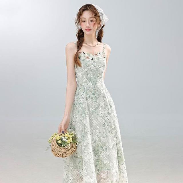 薄荷茶紀夏季度假風 綠色吊帶連衣裙 收腰長裙