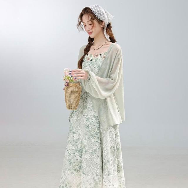 薄荷茶紀夏季度假風 綠色吊帶連衣裙 收腰長裙