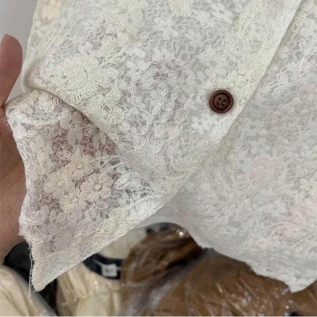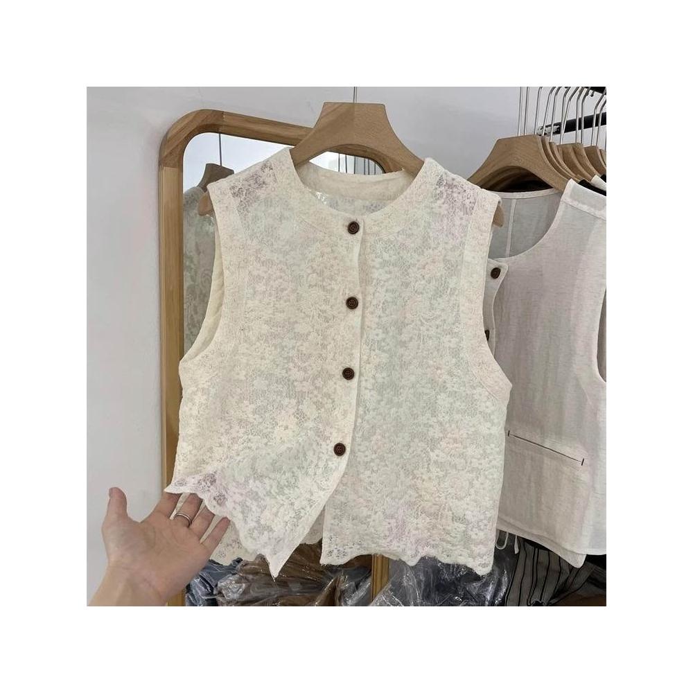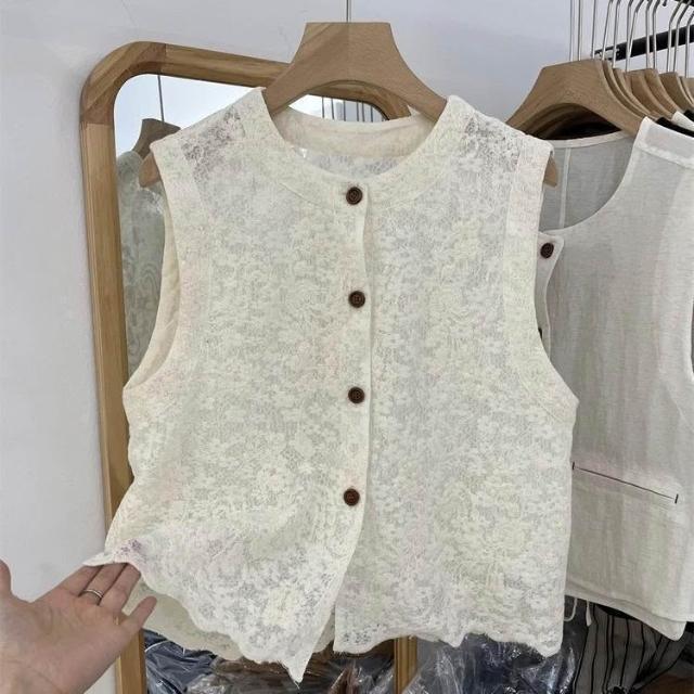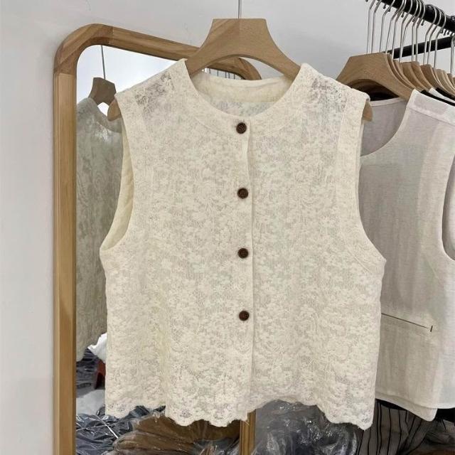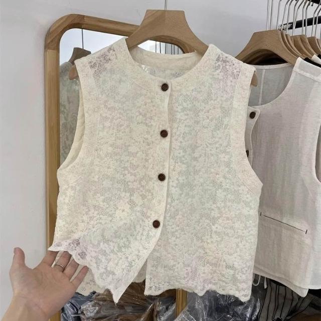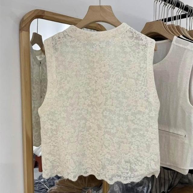 法式甜美蕾絲鏤空無袖馬甲女 夏季新款單排扣 寬鬆氣質坎肩開衫上衣