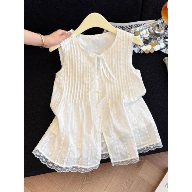 法式蕾絲刺繡白色襯衫女 夏季壓褶繫帶獨特絕美上衣