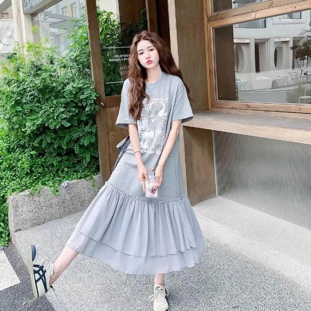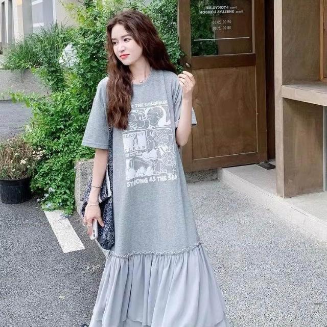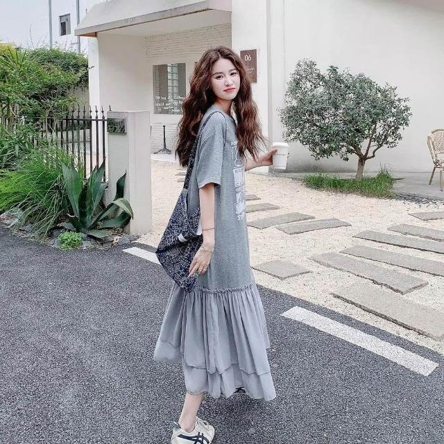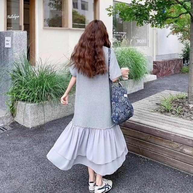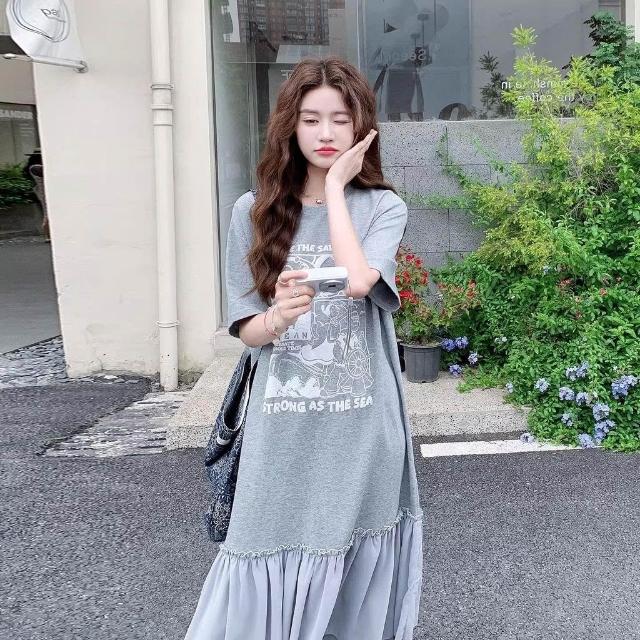 寬鬆大碼連衣裙 夏季2026新款 短袖長裙女 印花韓版拼接T恤 休閒衣