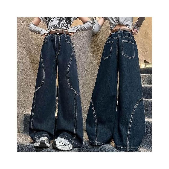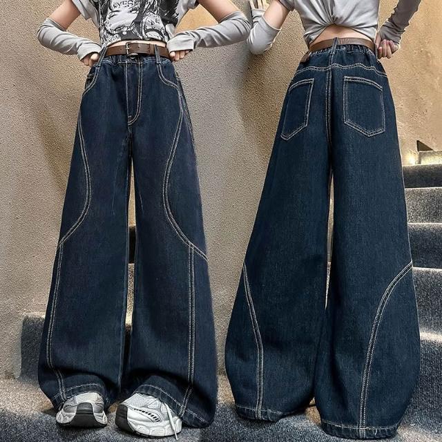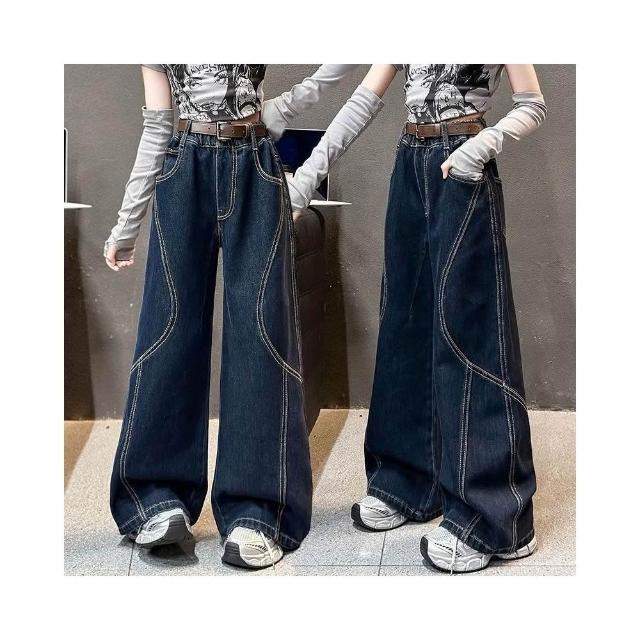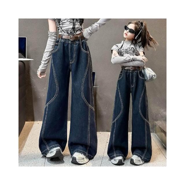 中大女兒童牛仔褲春秋新款 明線點綴 拼接牛仔闊腿褲 潮流百搭直筒褲 彎刀褲