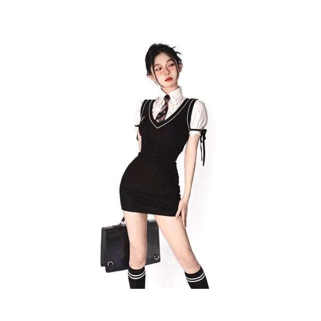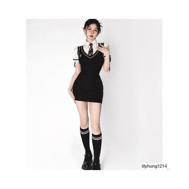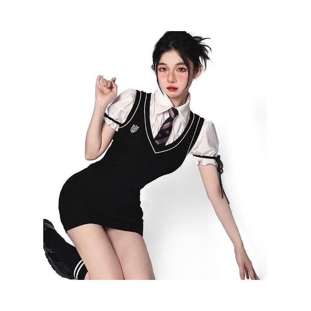 薹潮好運 韓式學院風馬甲連衣裙小黑裙女純欲jk制服泡泡袖襯衫+包臀裙套裝制服學院風韓版水手服學生辣妹裝性感大尺碼制服