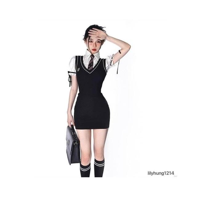 薹潮好運 韓式學院風馬甲連衣裙小黑裙女純欲jk制服泡泡袖襯衫+包臀裙套裝制服學院風韓版水手服學生辣妹裝性感大尺碼制服