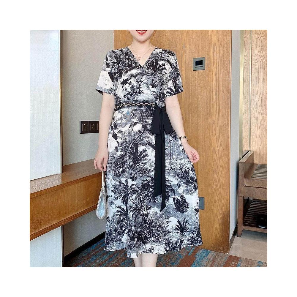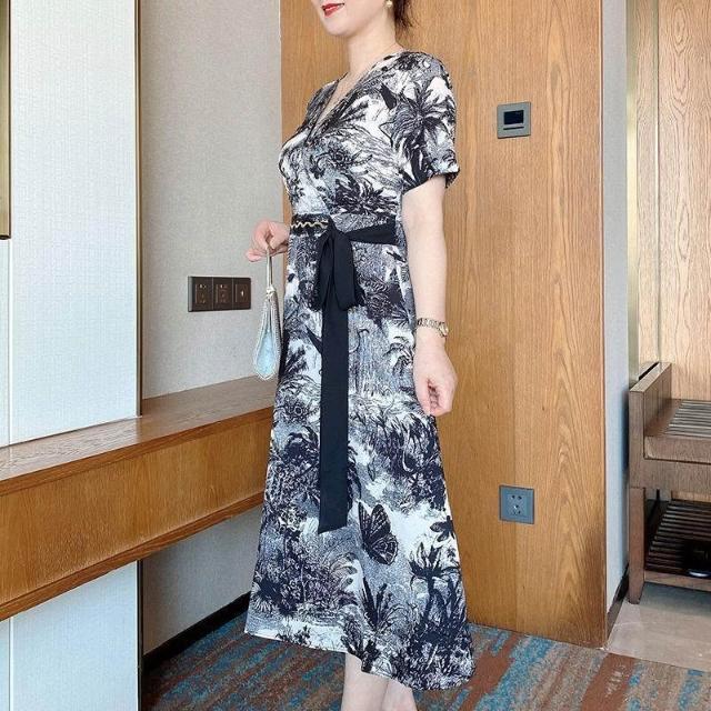 臺潮好運2026新款 中年媽媽夏季 洋氣印花連衣裙 中老年時尚短袖 雪紡裙子