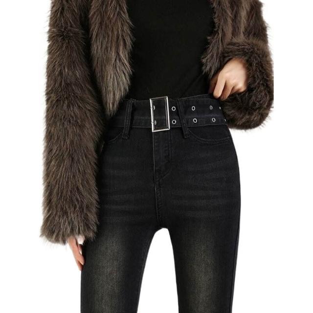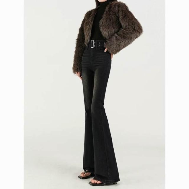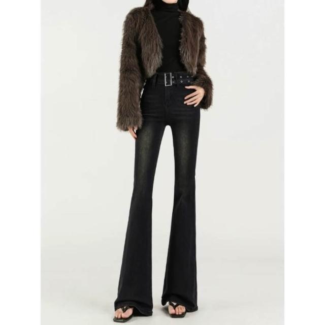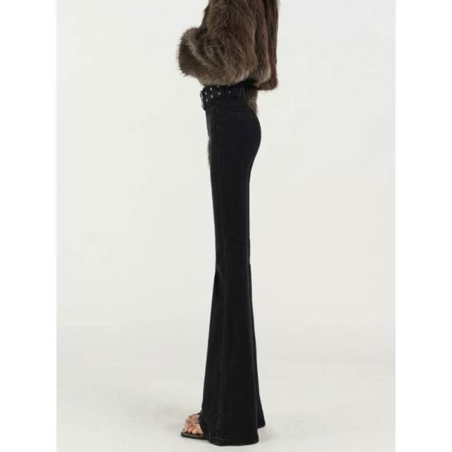 核桃小鋪 復古黑色微喇牛仔褲女春秋高腰設計感腰帶辣妹修身加長拖地喇叭褲 3