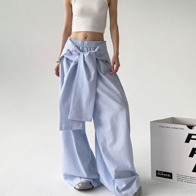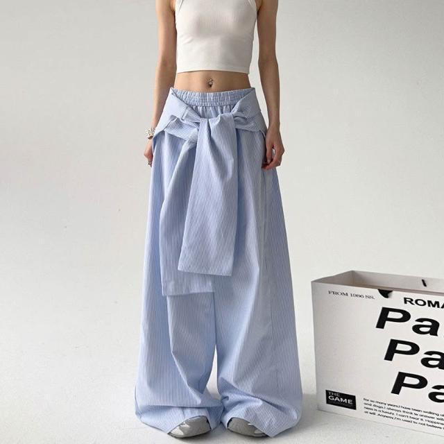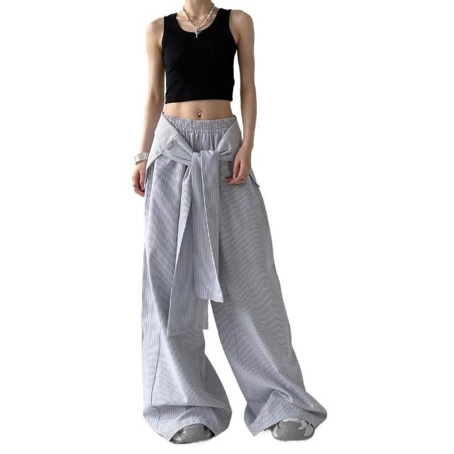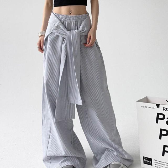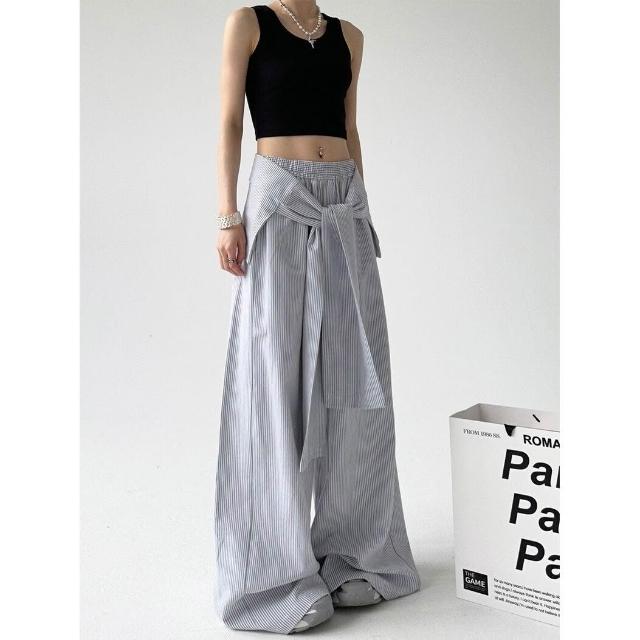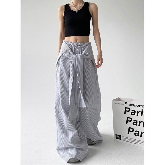 核桃小鋪 春秋季條紋休閑褲女綁帶腰封寬松直筒闊腿褲 拖地長褲子 3