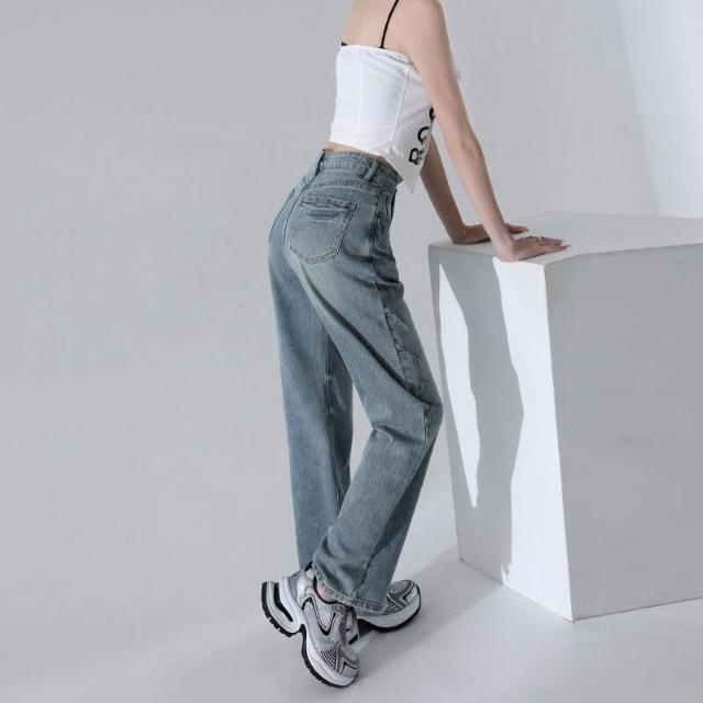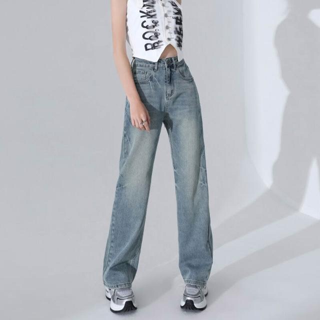 核桃小鋪 牛仔褲女淺藍高腰復古春夏2024年寬松垂感直筒闊腿長褲高腰顯瘦 3