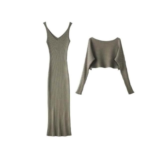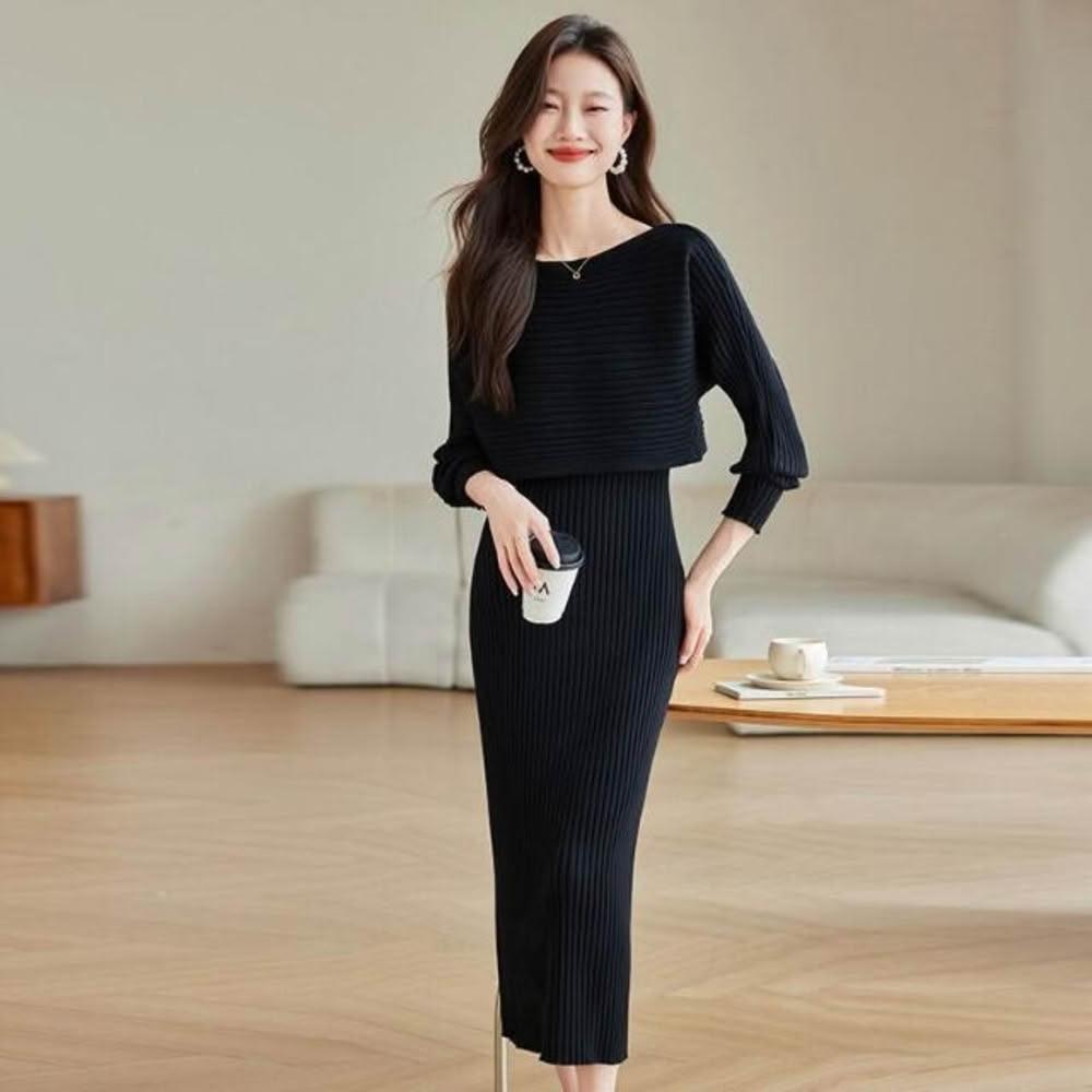 核桃小鋪 韓版秋冬季純欲一字領長袖坑條針織衫修身包臀長款連衣裙兩件套裝 3