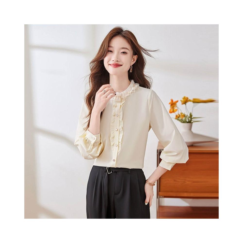 核桃小鋪 雪紡襯衫女春裝2025新款法式木耳邊立領別致上衣減齡洋氣打底小衫 3