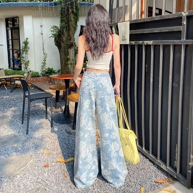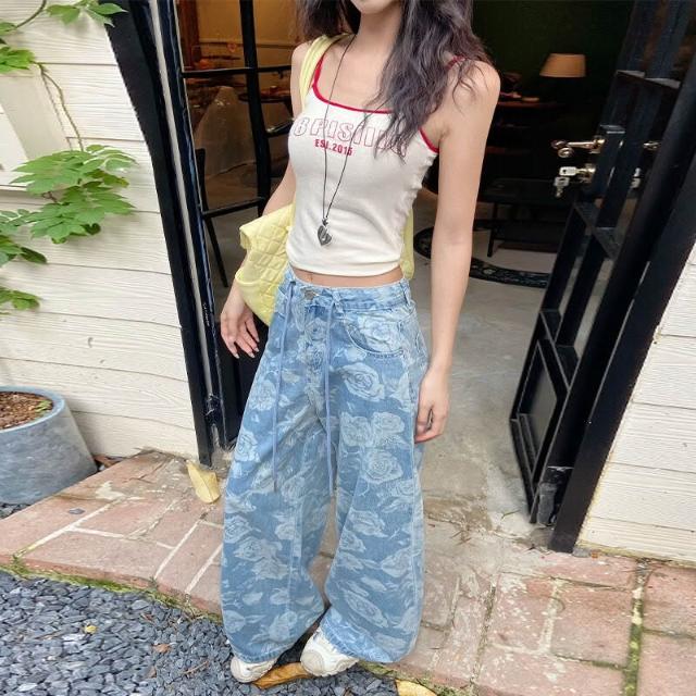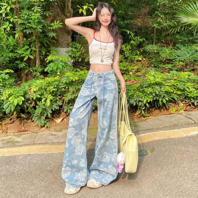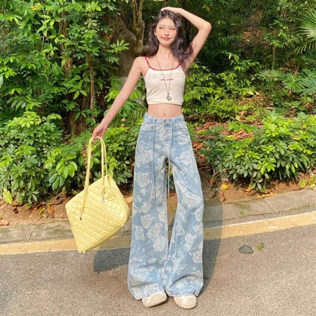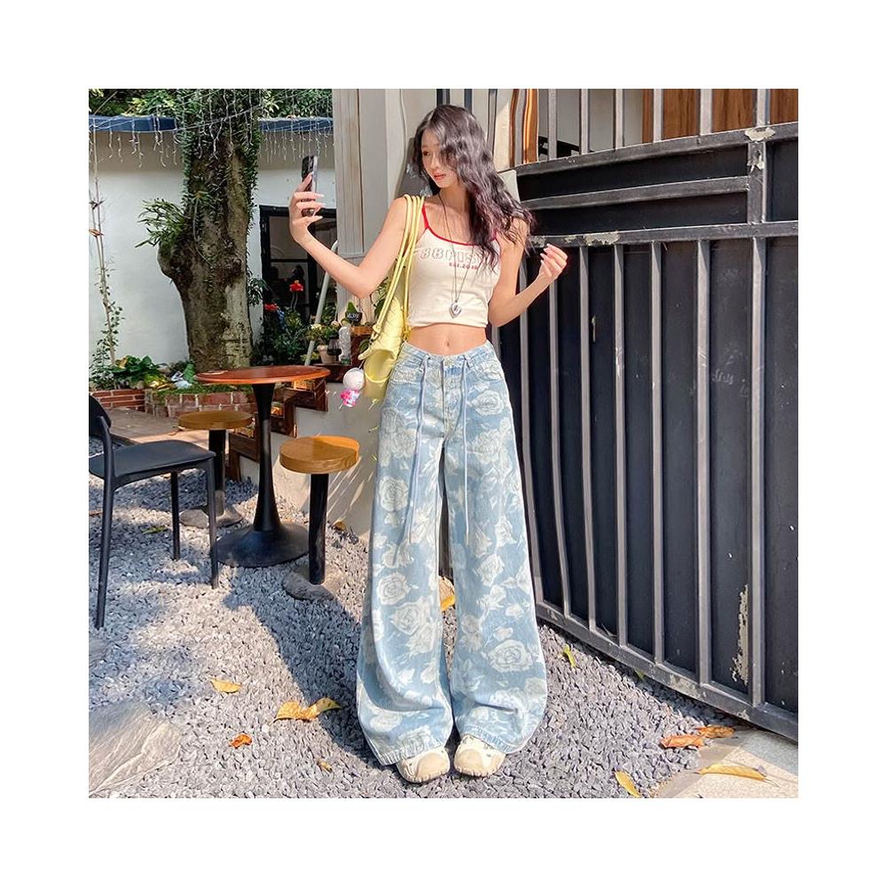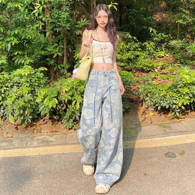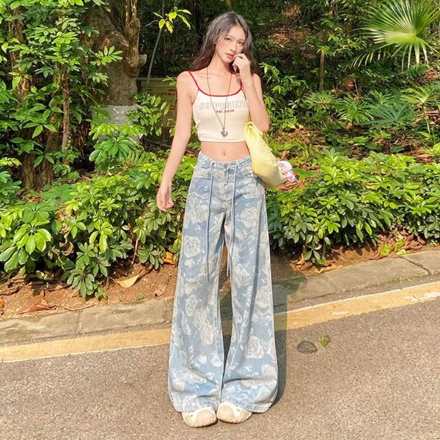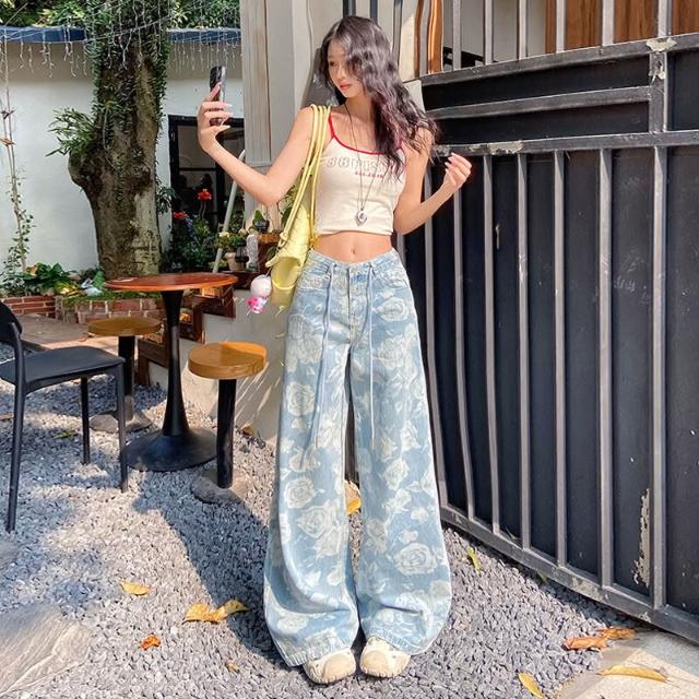 核桃小鋪 設計感提花抽繩闊腿牛仔褲女2025夏季新款高腰寬松顯瘦直筒拖地褲 3