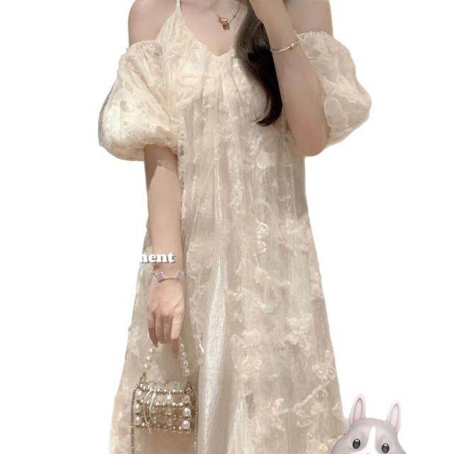 核桃小鋪 蝴蝶印花吊帶連衣裙女夏2024粉色露肩寬松顯瘦小個子氣質長裙蕾絲 3