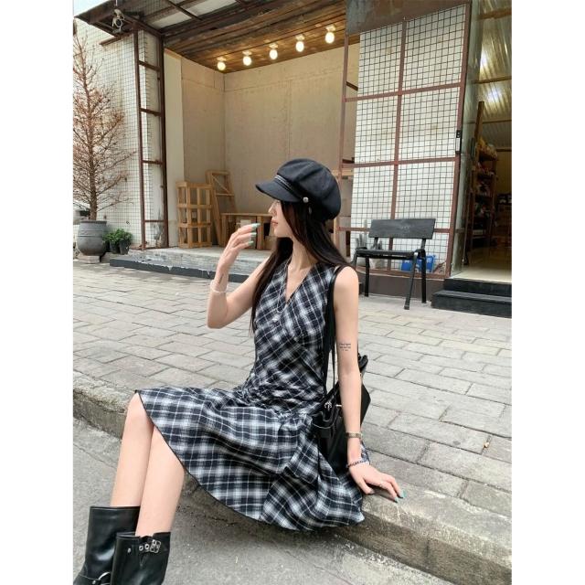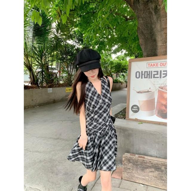 核桃小鋪 韓版復古格紋 領無袖掛脖收腰連衣裙女夏季2025新款小個子短裙子 3
