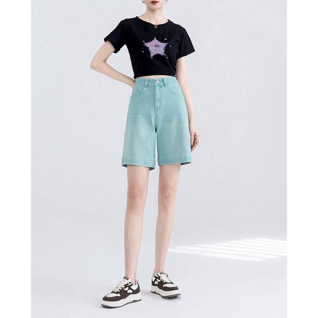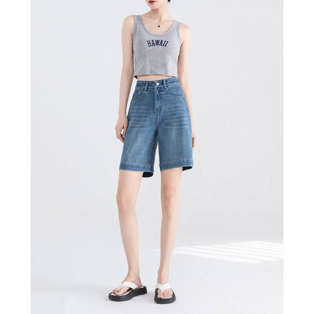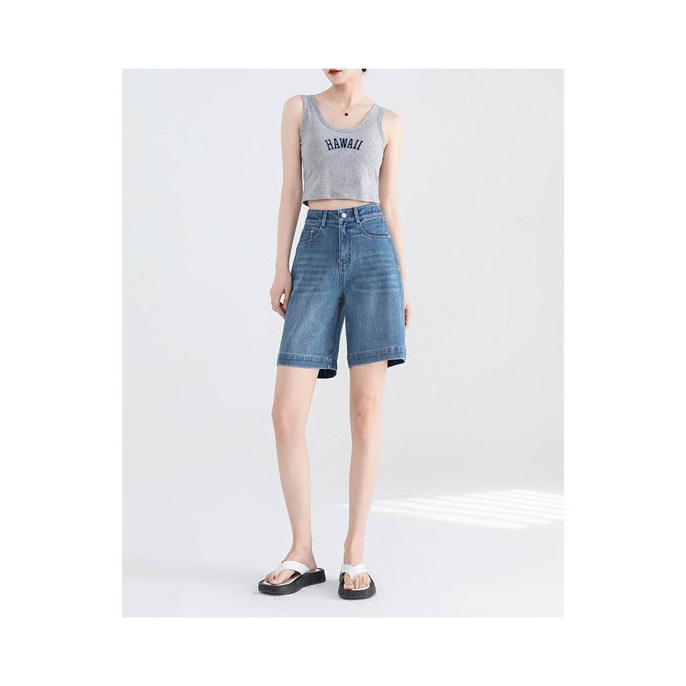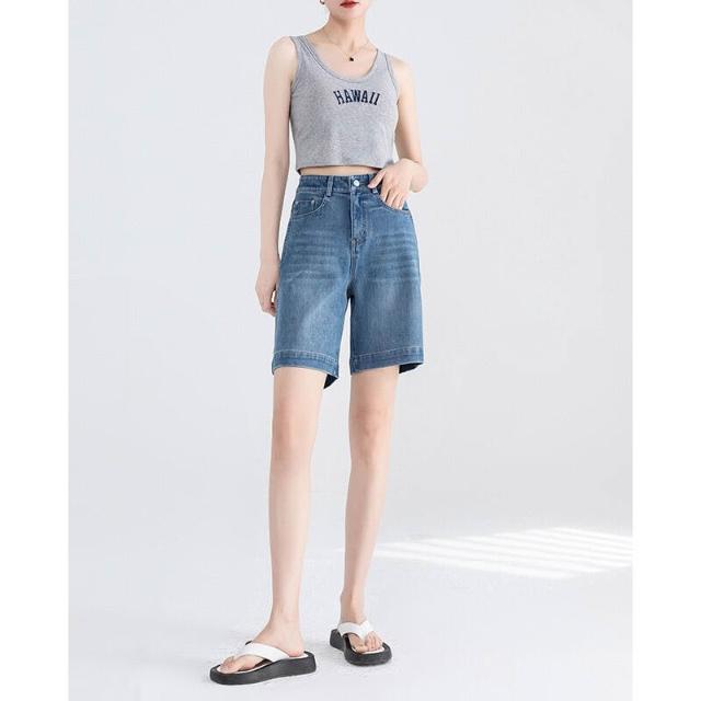 核桃小鋪 舒適感四面彈牛仔短褲女2025夏季新款高腰彈力顯瘦百搭直筒五分褲 3