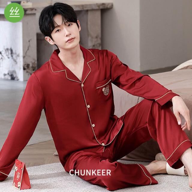 核桃小鋪 冰絲睡衣男士春夏開衫翻領結婚喜慶薄款長袖新婚高檔套裝紅色絲綢 3