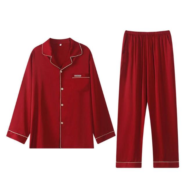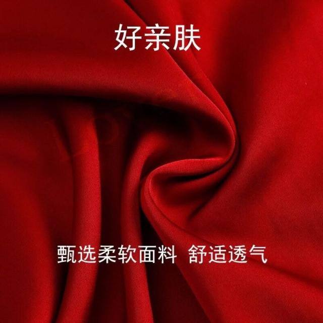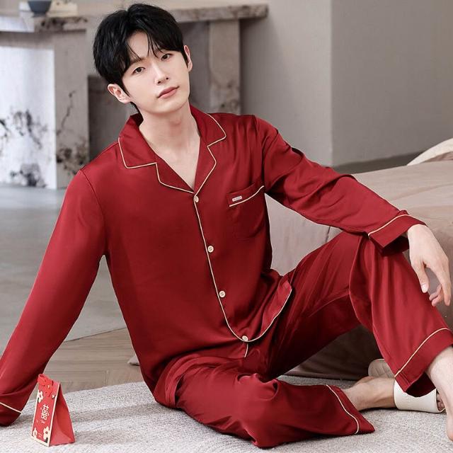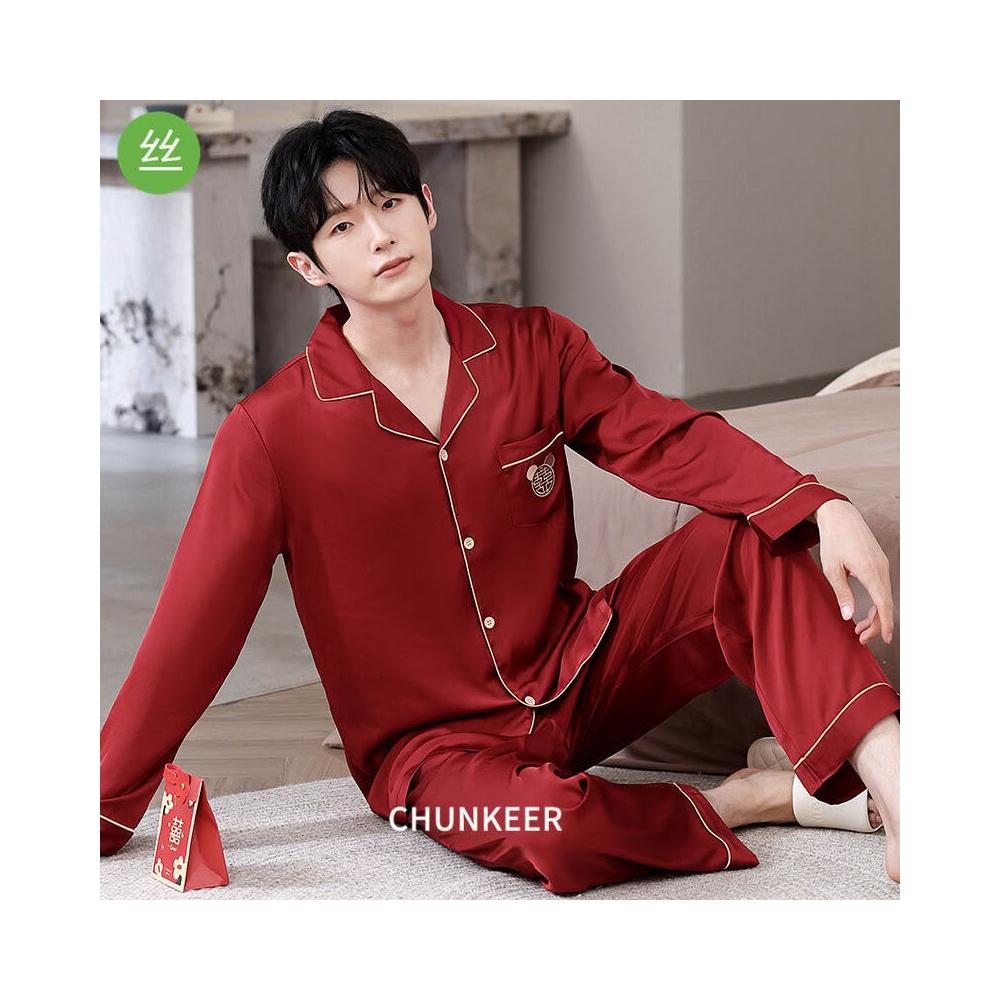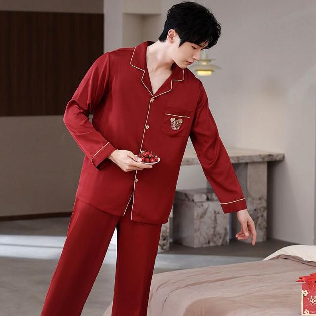 核桃小鋪 冰絲睡衣男士春夏開衫翻領結婚喜慶薄款長袖新婚高檔套裝紅色絲綢 3
