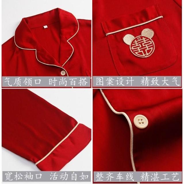 核桃小鋪 冰絲睡衣男士春夏開衫翻領結婚喜慶薄款長袖新婚高檔套裝紅色絲綢 3