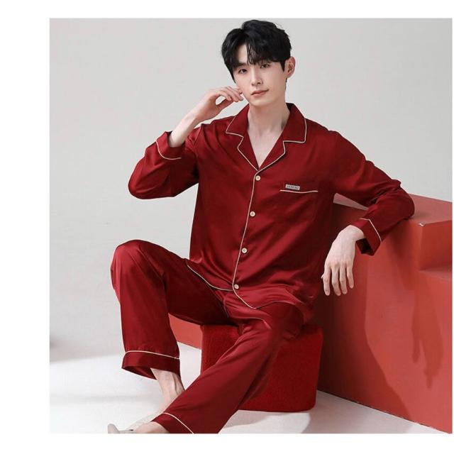 核桃小鋪 冰絲睡衣男士春夏開衫翻領結婚喜慶薄款長袖新婚高檔套裝紅色絲綢 3