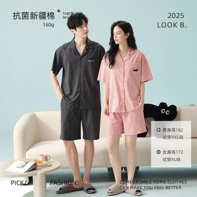 核桃小鋪 抗菌新疆棉春夏季薄款純棉情侶睡衣女士短袖條紋男家居服套裝 3