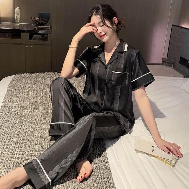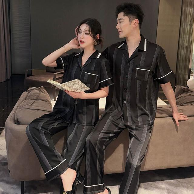 核桃小鋪 冰絲情侶睡衣女春季薄款短袖長褲條紋印花套裝網紅輕奢男士家居服 3