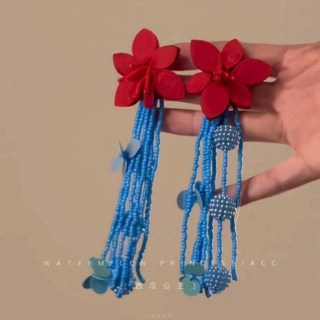 joseph流行藍色耳環女紅色花朵民族風長款流蘇度假風耳飾