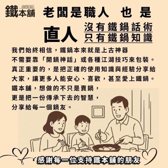- 鐵鍋屬於食品接觸容器, 商品一經下水清洗、開火或實際使用, 基於衛生與安全考量,恕不接受退貨。 請於未使用前確認商品規格與需求, 未下水、未使用商品仍可依平台規範辦理退換貨。