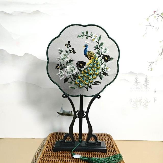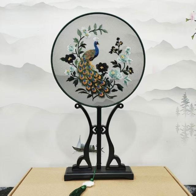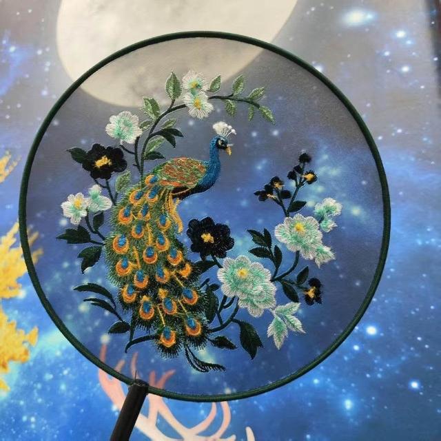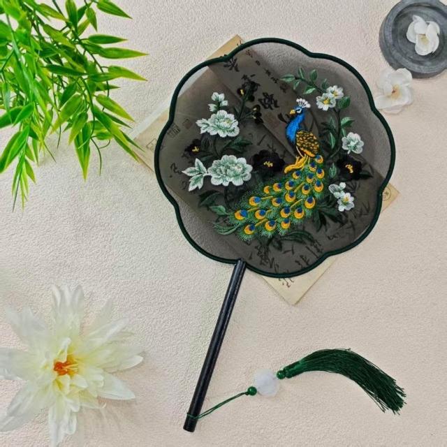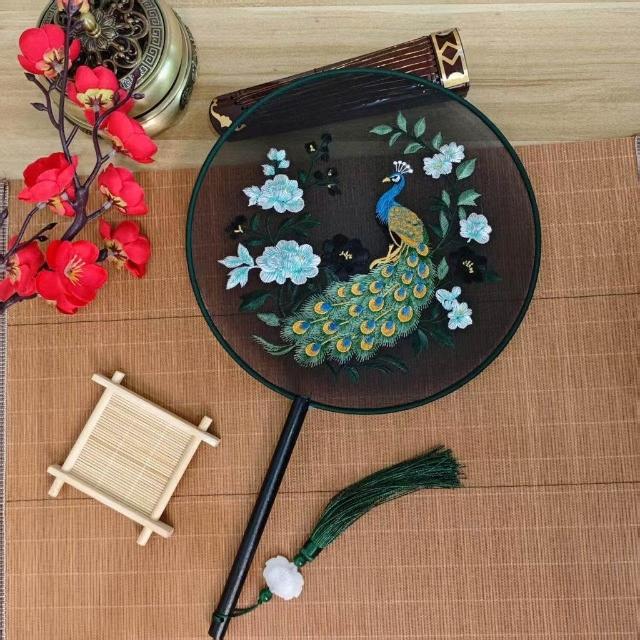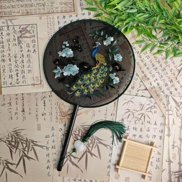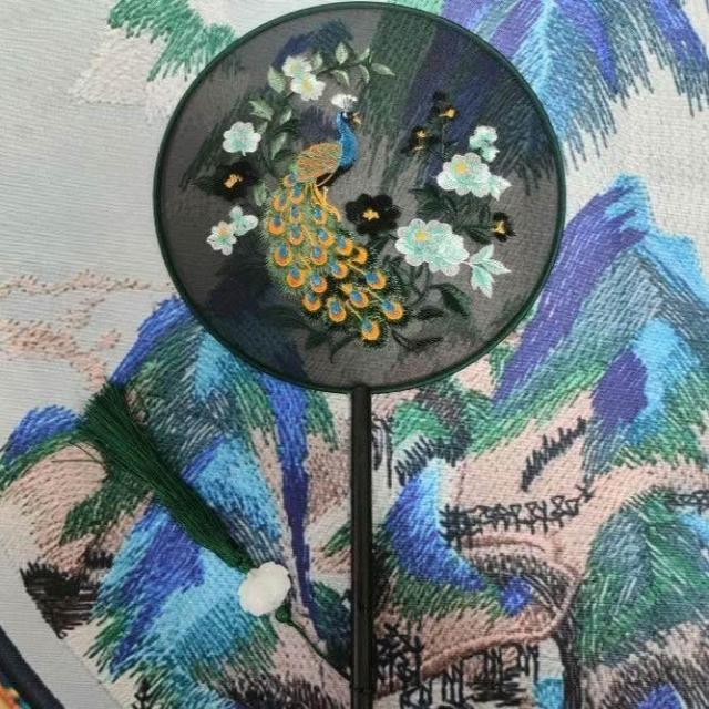 蘇繡團扇雙面繡黑金孔雀繞絲包邊舞蹈刺繡扇子工藝古典古風