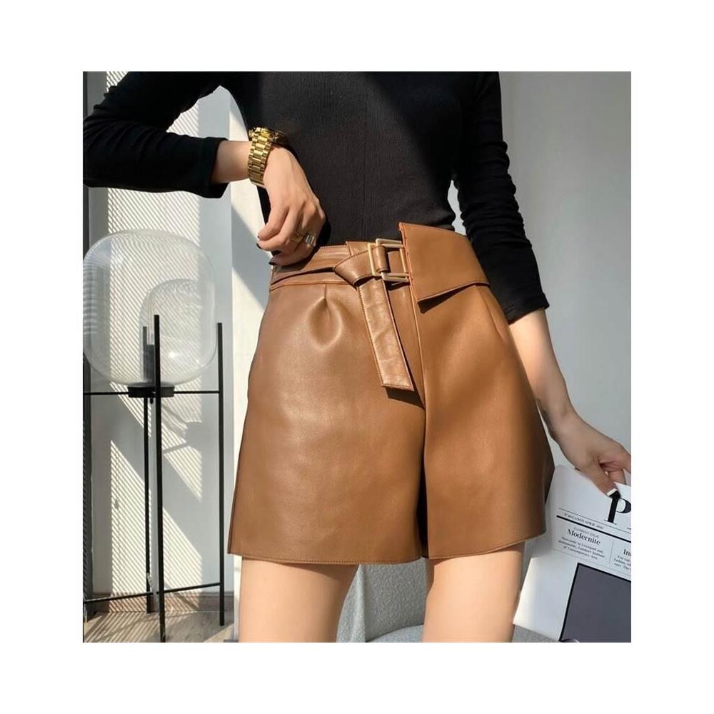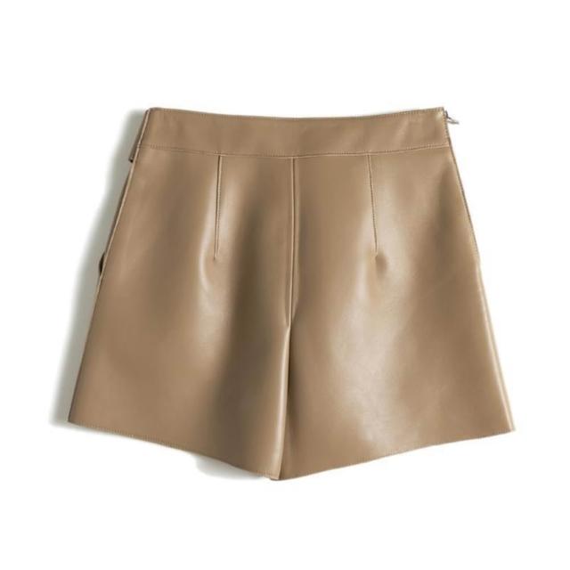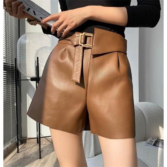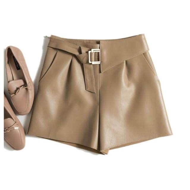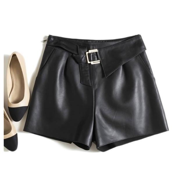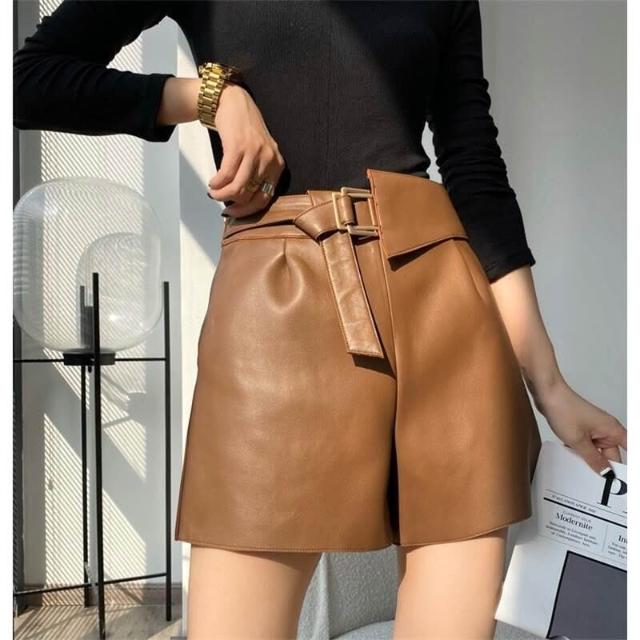 高極時髦 綿羊皮短褲女靴褲顯瘦高腰A字闊腿真皮皮褲