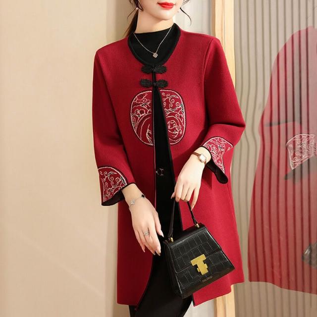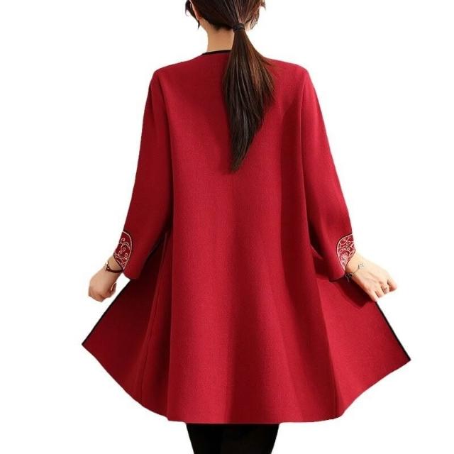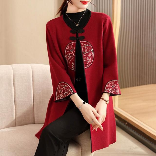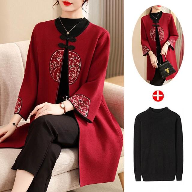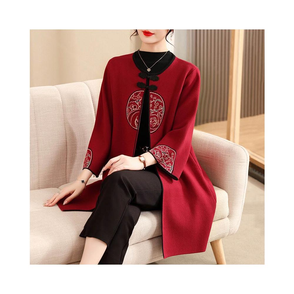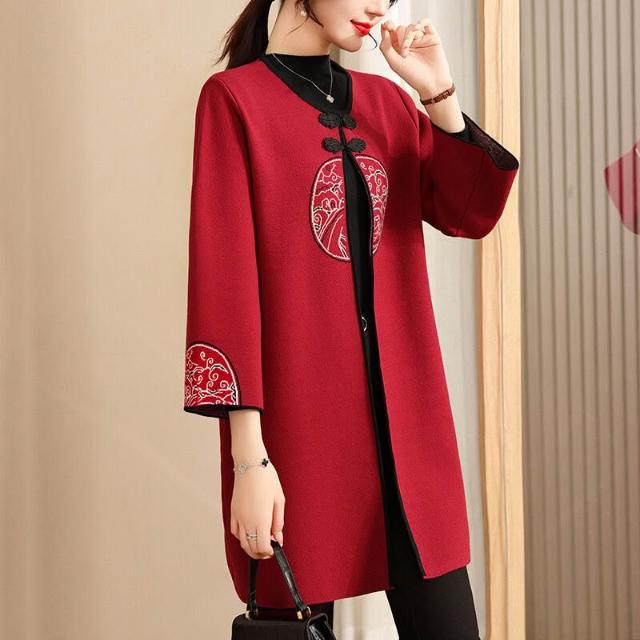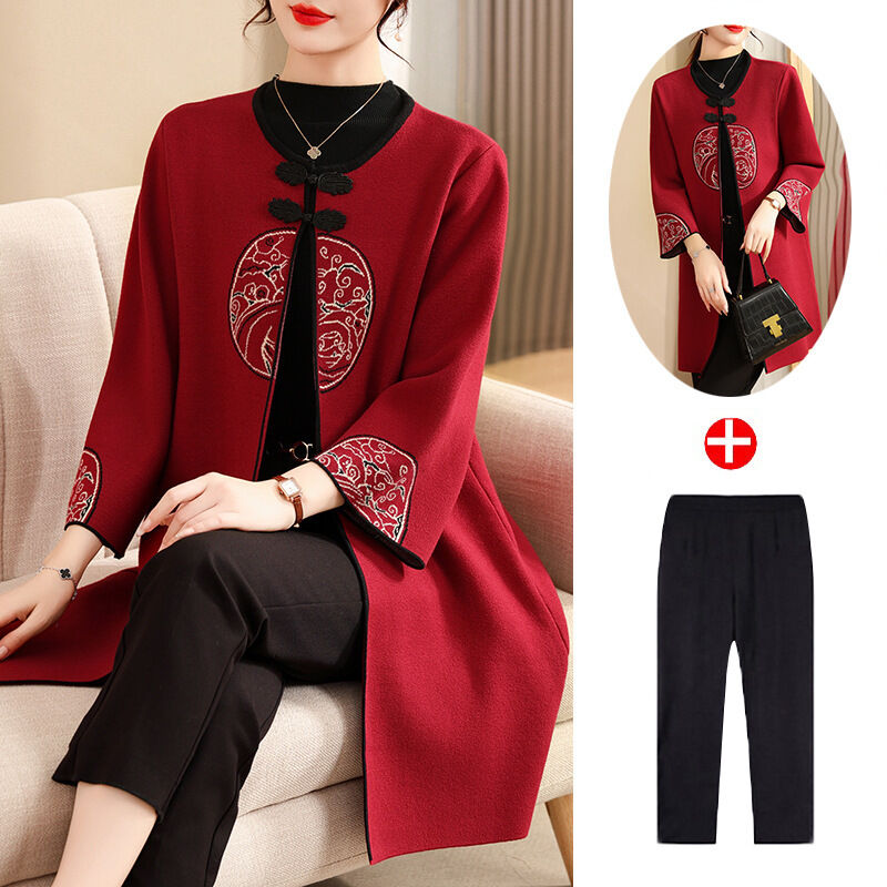 新品上架 媽媽秋裝國風毛衣外套50歲大衣紅色本命年中老年女秋冬婚宴禮服