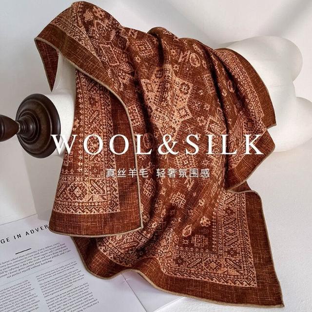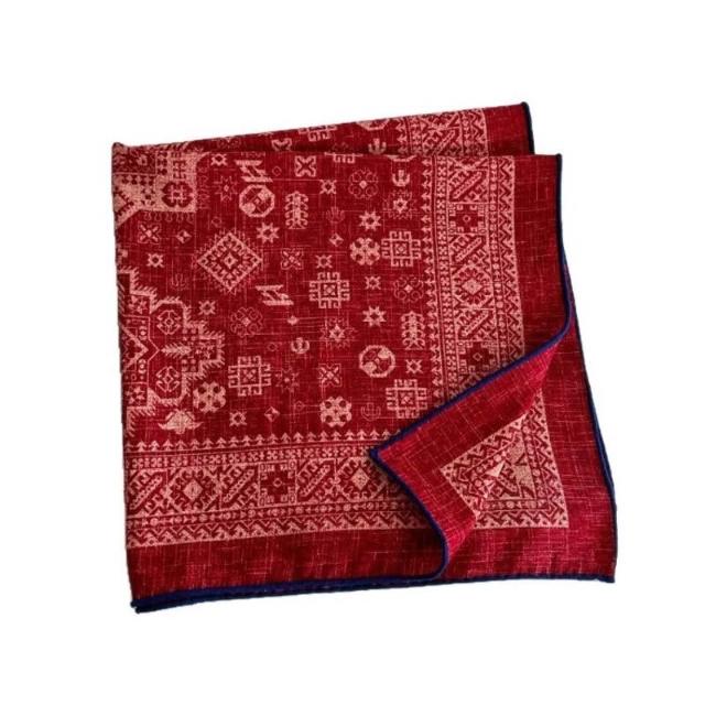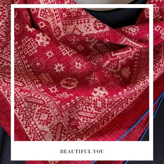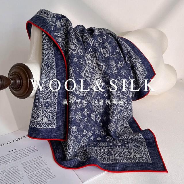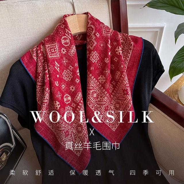 新品上架 經典紅色腰果花真絲羊毛圍巾女復古百搭雙面印花男女同款絲毛方巾