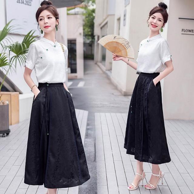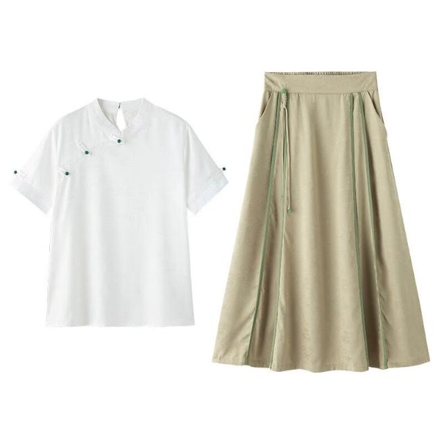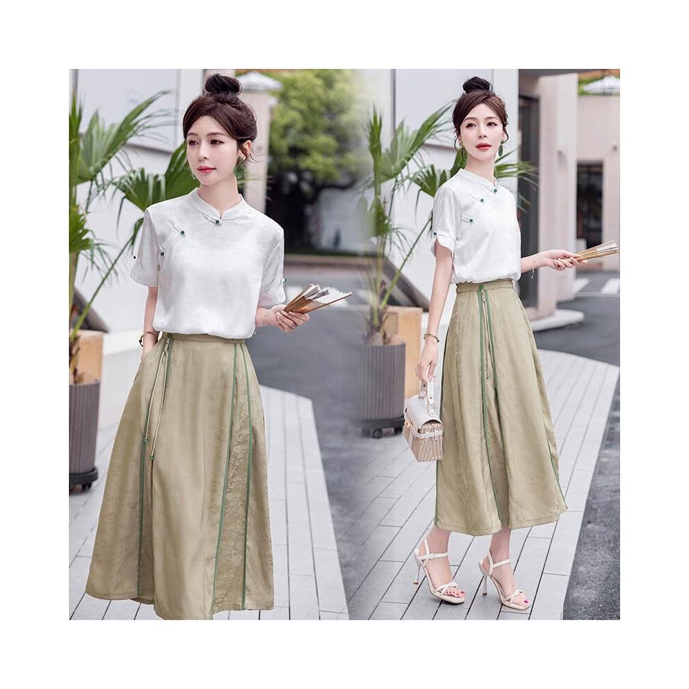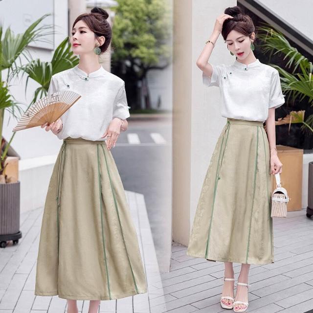 新品上架 旗袍改良版馬面裙少女短袖上衣半身裙兩件套裝時尚氣質