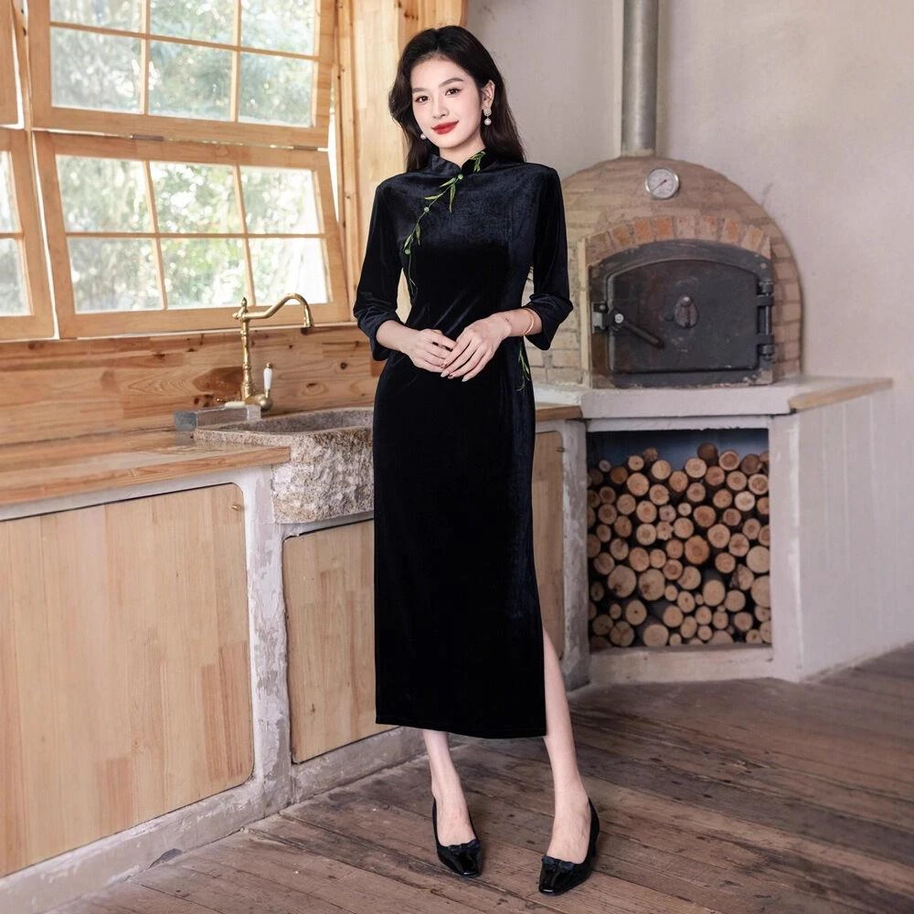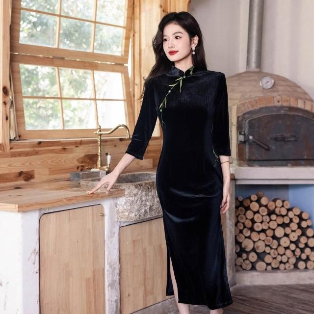 新品上架 黑色新中式絲絨國風改良刺繡旗袍女2025新款高端復古春秋日常可穿
