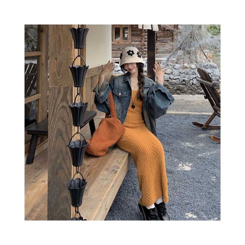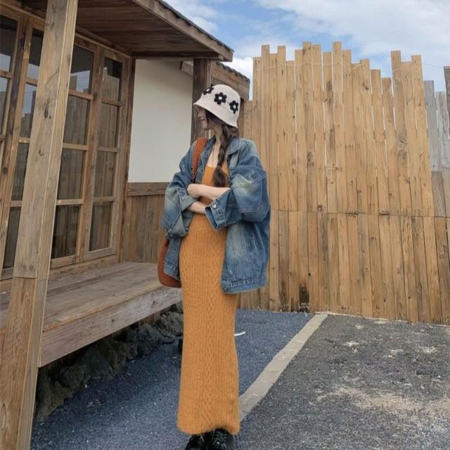 春夏上新 復古氣質套裝做舊POLO領牛仔外套女秋冬橘色針織吊帶連衣裙兩件套