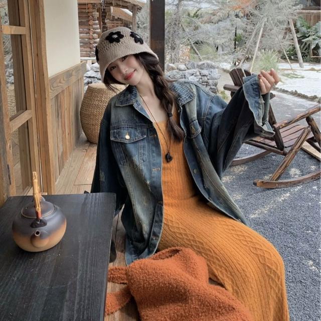 春夏上新 復古氣質套裝做舊POLO領牛仔外套女秋冬橘色針織吊帶連衣裙兩件套
