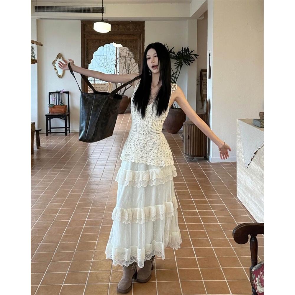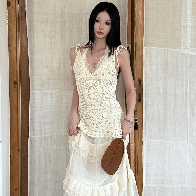 春夏上新 蕾絲綁帶吊帶手工針織镂空背心罩衫高腰蕾絲蛋糕裙內搭外穿