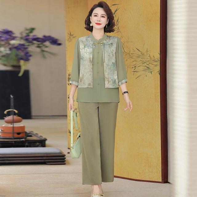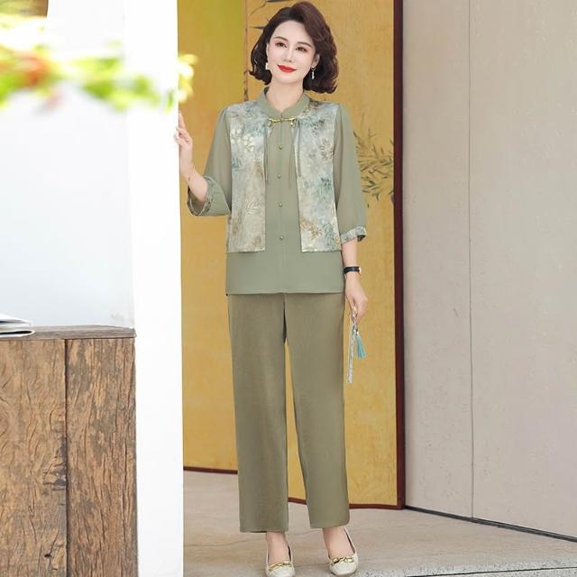 女装 两件套 套装 新款潮流國風舒適時尚媽媽裝印花兩件套小立領珠扣上衣+休閑褲 煦煦衣橱