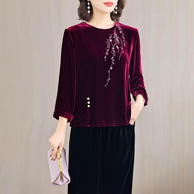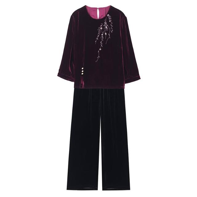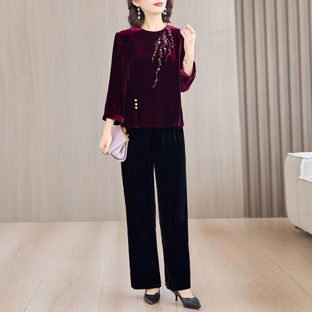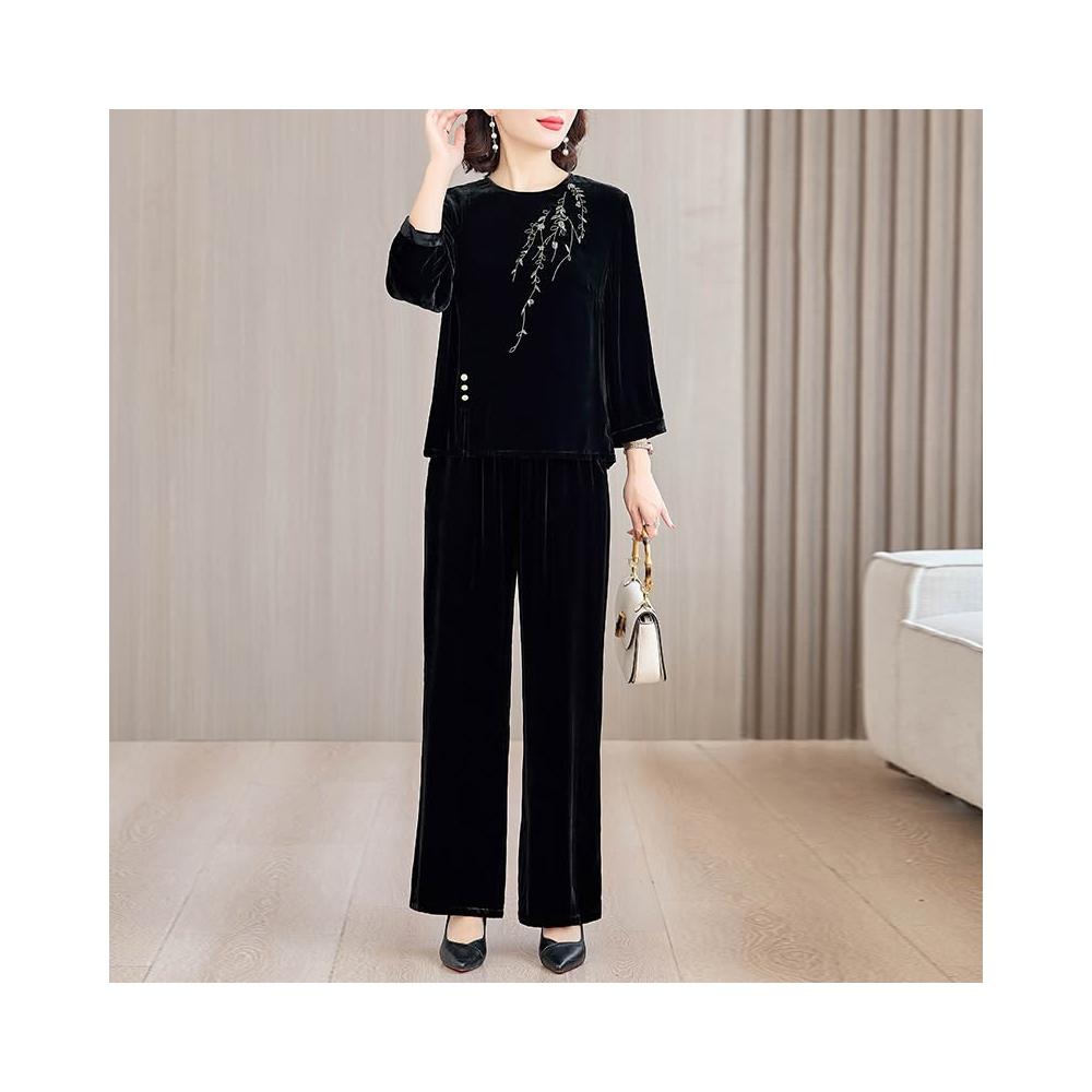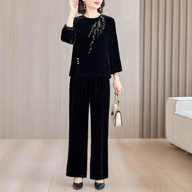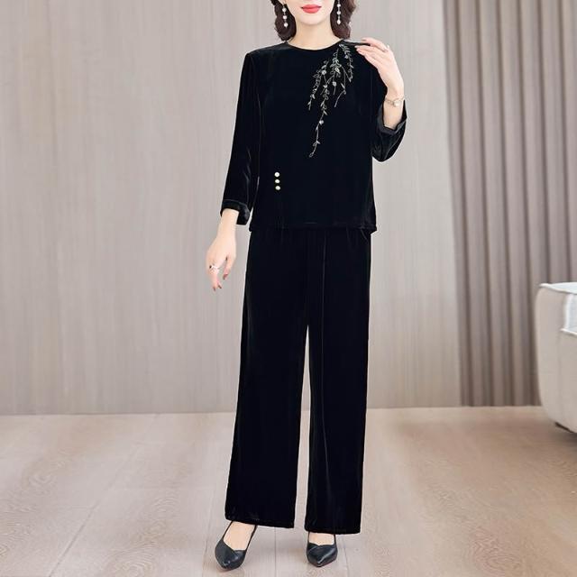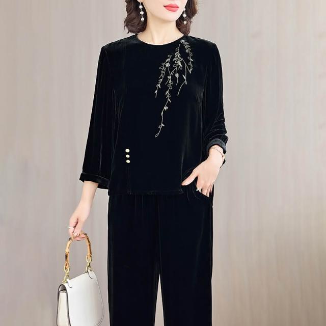 女装 两件套 套装 金絲絨套裝圓領黑色上衣女春秋新款端莊大氣媽媽兩件套桑蠶絲褲子 煦煦衣橱