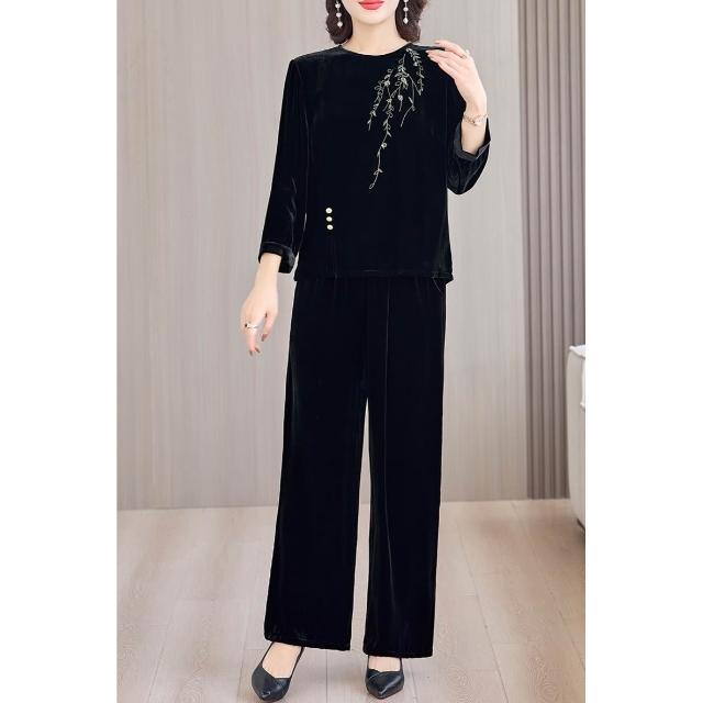 女装 两件套 套装 金絲絨套裝圓領黑色上衣女春秋新款端莊大氣媽媽兩件套桑蠶絲褲子 煦煦衣橱